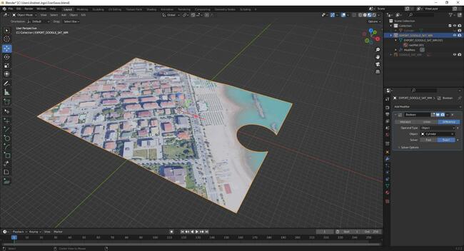 19. Immagino che l'addon sia BlenderGis... Per eliminare delle aree dalla mappa creata in maniera rapida, puoi modellare in 3D l'area da eliminare (es. il mare o l'isola) e applicare un modificatore booleano. P.s. per l'elevazione hai la Api Key di OpenTopography, giusto? esempio con un cilindro Differenza con mod booleano