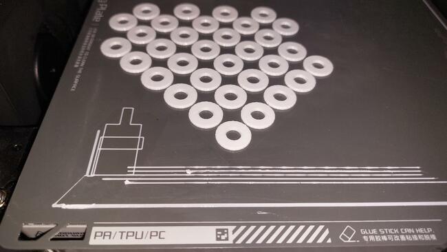 15. Se la metti in forno a 150° per un ora si rinforza o altro? La stampa non perde precisione nelle dimensioni? Io sto attualmente stampando il policarbonato con piatto a 110° e estrusore a 280° (con camera chiusa) e non noto differenze con il PLA, sia in termini di qualità che di adesione al piatto. Ho appena finito di stampare queste rondelle in PC...
