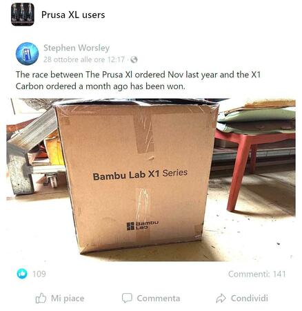 10. Altre news sulla versione "economica" della X1... Dovrebbe essere modulare così da poter implementare per step telecamera, box esterno (che dovrebbe essere stampabile dall'utente)... mancherebbe solo il sensore Lidar per la regolazione del flusso di stampa ma ha il wifi e ci si può collegare l'AMS. Esiste anche un link per la quick start guide https://device.report/m/ceefe2538a31584817594ad2665626c7ae5db968de5cc5a512cef62d9866e4a4.pdf Adesso è da capire a che prezzo la mettono. P.s. sul gruppo dei preordini della Prusa XL tanti stanno annullando i preordini per la X1 Carbon (più piccola come area di stampa ma anni luce come tecnologia) e i fanboy Prusa sono inferociti (anche perché sono in preorder da un anno).