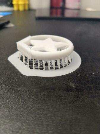 Poi arriva nella zona di stampa, fa la sua righina di pre-estrusione, ma visto che c'è il ricciolo in mezzo alle balle, quando stampa il primo strato prima o poi lo urta, se lo trascina nell'area di stampa, e fa un macello.