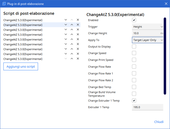 Ho seguito una guida di uno youtuber di nome Luca Barsanti. Queste sono le prime due macro, le successive ho incrementato di 10 il valore di "Change Height" per ogni temperatura. Alla fine ho cliccato Chiudi e poi su Sezionamento. Ora sto impostando io manualmente dalla stampante ad ogni passaggio di scalino. -