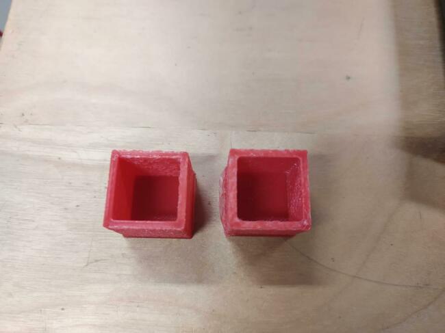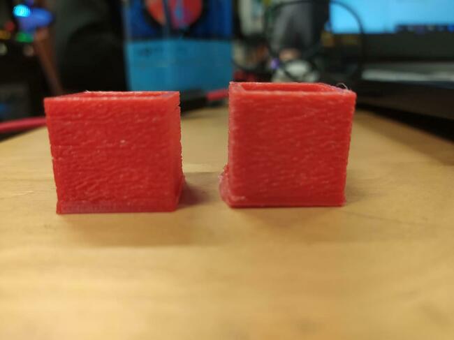 3. Buongiorno, Sono un novizio del mondo delle stampanti ed avrei un problema con una stampante AnyCubic Chiron che utilizzo nel laboratorio dove studio. Provando a stampare dei cubi di test in PLA la stampa viene tutta zigrinata e poco precisa. Ho provato a cambiare un attimo i settaggi come temperatura e profilo ma nulla, la stampa rimane ancora errata (allego foto delle stampe a sinistra quella con una t maggiore e spessore minore). Per caso può essere un problema di settaggio o di qualche parte della stampante? Ho provato ad estrudere un po' di plastica prima della stampa e il filo che crea e liscio e regolare. Grazie mille per l'aiuto in anticipo