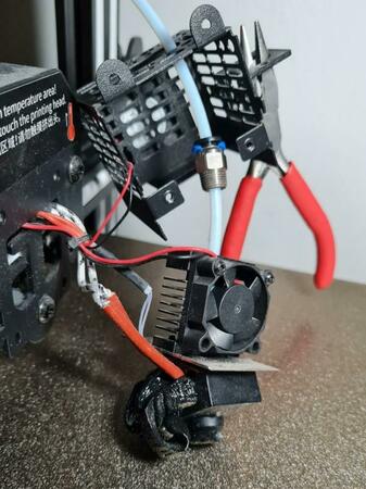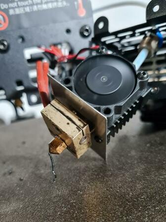 Al ritorno il disastro. Ora, magari il titolo è un po' esagerato ma qua mi pare che si è sfondato tutto l'hotend, l'ugello non lo riconosco neanche più, è tuto storto ...e il materiale fuoriuscito dall'alto? E' recuperabile la situazione? Si può cambiare solo l'hotend?