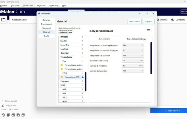 devo premettere una cosa che avrei voluto scrivere ma non ne ho avuto il tempo. Da pochi giorni ho cambiato il filo della stampante da PLA a PETG. Informandomi in merito ho capito che avrei dovuto alzare la temperatura dell'ugello e del piatto.
