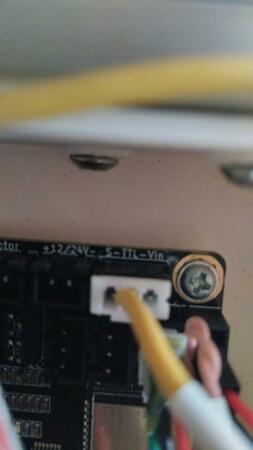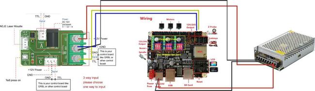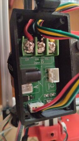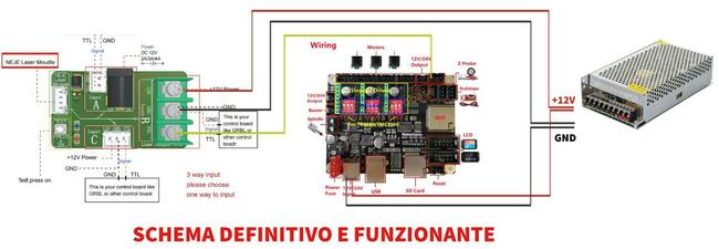 Per comandare il laser, gli ho dato i 12 V diretti dall'alimentatore con cavi da 4 mm (per maggior sicurezza...) e quando accendo il tutto si accende anche il laser (ma non il raggio).