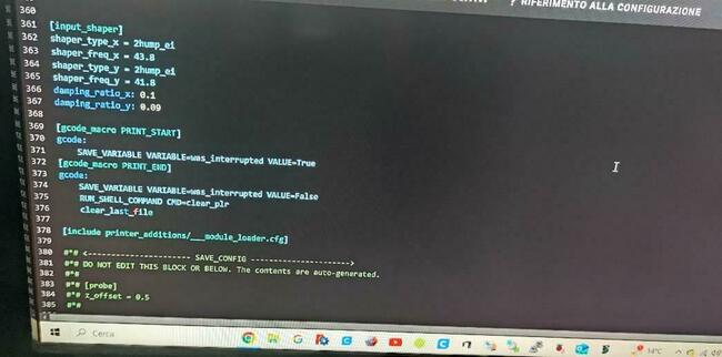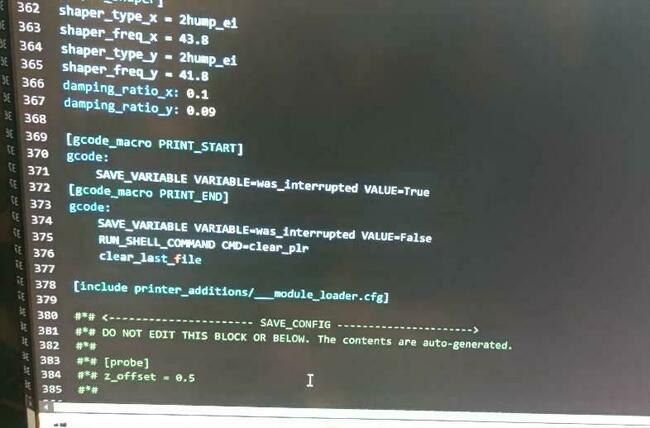 Pad sovol 32gapprendista ha risposto a apprendista nella discussione Software di slicing, firmware e GCode nulla da fare. ricancellato e rifatto ma nulla [input_shaper] damping_ratio_x: 0.05 damping_ratio_y: 0.1 shaper_type_x = 3hump_ei shaper_freq_x = 40 shaper_type_y = 2hump_ei shaper_freq_y = 40 [gcode_macro PRINT_START] # 将 PRINT_START 设置为开始打印时的宏,自定义打印前的动作 gcode: SAVE_VARIABLE VARIABLE=was_interrupted VALUE=True [gcode_macro PRINT_END] gcode: SAVE_VARIABLE VARIABLE=was_interrupted VALUE=False RUN_SHELL_COMMAND CMD=clear_plr clear_last_file # Klipper Printer Additions Start [include printer_additions/___module_loader.cfg] # Klipper Printer Additions End #*# <---------------------- SAVE_CONFIG ----------------------> #*# DO NOT EDIT THIS BLOCK OR BELOW. The contents are auto-generated. #*# #*# [probe] #*# z_offset = 0.5 #*# l'errore scrive riga 17 , che è vuota però