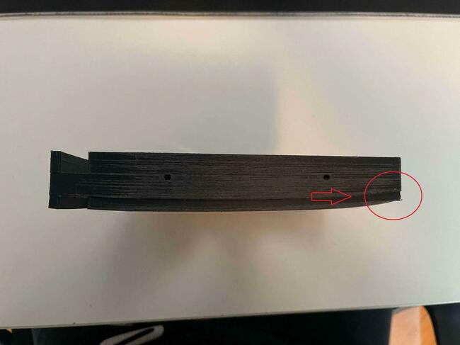 Ho seguito tutti i consigli che mi avevate dato e questi sono i risultati ottenuti. Un angolo del pezzo, dopo quasi un'ora abbondante di stampa, ha cominciato a deformarsi (warping), creando così una superficie difettosa e facendo sì che l'estrusore grattasse sul pezzo. Nella seconda foto, una parte della stampa presenta una superficie rugosa e irregolare; potrebbe essere causata dal calore o dipendere dal warping, dato che si trova nello stesso lato dove è avvenuto il distacco dal piatto di stampa?