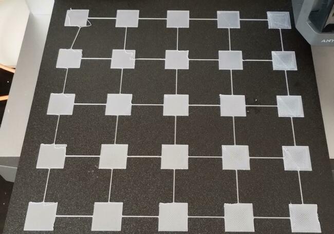 Penso che i risultati dei test che sto facendo non siano malvagi, considerato che sto usando PLA anycubic. gli ultimi 2 test sono sul fronte piatto e retro. in giornata foto rifatto bed 5x5 e non risulta uniforme -
