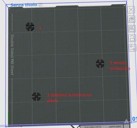 Fatto verifica di tutte le puleggie con gli eccentrici e strette un pò. Fatto procedura idicata sul link che mi hai mandato e poi attivato il livellamento prima della stampa; in questo caso fa tutto il piatto e non solo il centro. Poi fatto una prima stampa di quelle che fallivano ed è uscita con le pareti laterali bene per entrambi i campioni sul piatto. Rifatto prova con il file con i 3 pezzi separati e il primo pezzo non si è attaccato al piatto, il secondo così e così e il terzo portava la testina a strusciare. Ho come l'impressione che il piatto sia inclinato e il livellamento non funziona, deve essere rifatto ogni volta e il risultato nemmeno è certo. Ci rinuncio... non so più cosa fare. Inizio a pensare alla Bambulab A1 sperando non mi dia problemi. -