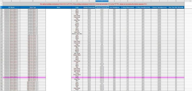 1. Ciao a tutti, devo stampare per la prima volta con una resina abs like 3.0 elegoo sulla mia stampate saturn s ma non trovo tutti i parametri, potreste gentilmente aiutarmi ad impostarla in maniera ottimale.......purtroppo sono anche un pochino boomer, inserisco quello che ho trovato, ossia la schermata di chitubox ed un foglio di calcolo con alcuni parametri della resina in questione....... grazie forse questa immagine é migliore per quanto riguarda i parametri