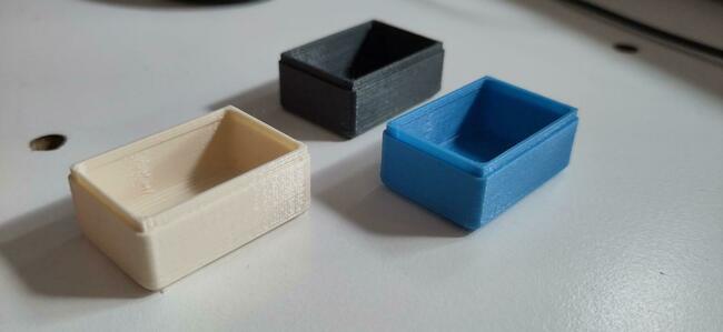2. Come feedback vi posto le foto di tre scatoline cha ho stampato con tre fili diversi di PLA, sempre di 10 anni fa. Ho scelto le scatoline perchè volevo vedere l'uniformità dei piani delle facce per individuare più facilmente (secondo me) i difetti. Sono soddisfatto perchè sono venute esattamente come me le aspettavo. Paramentri di default, usando Slic3R. Vmax 60 mm/s. Spessore strati 0.2 mm. Il PLA è stato conservato sopra la mia libreria, esposto all'aria ed alla polvere. Infatti ho dovuto anche spolverarli prima dell'uso! E' stato un luglio/agosto caldo, e sono stato via tre settimane ad agosto, quindi la temperatura del secondo piano sarà arrivata a 30 gradi. Un mese a 28/30 gradi avrà fatto lo stesso effetto di qualche ora di forno a 40 gradi? Ora per l'inverno li chiudo in scatole ermetiche, magari con del silica gel. Ne ho accumulato una certa quantità per altri usi, riciclato in vecchia padella, chiuso in buste di carta e conservato in tupperware, da mettere con gli oggetti alla bisogna. Lunga vita alla mia Prusa Mk 1 ! Ciao!