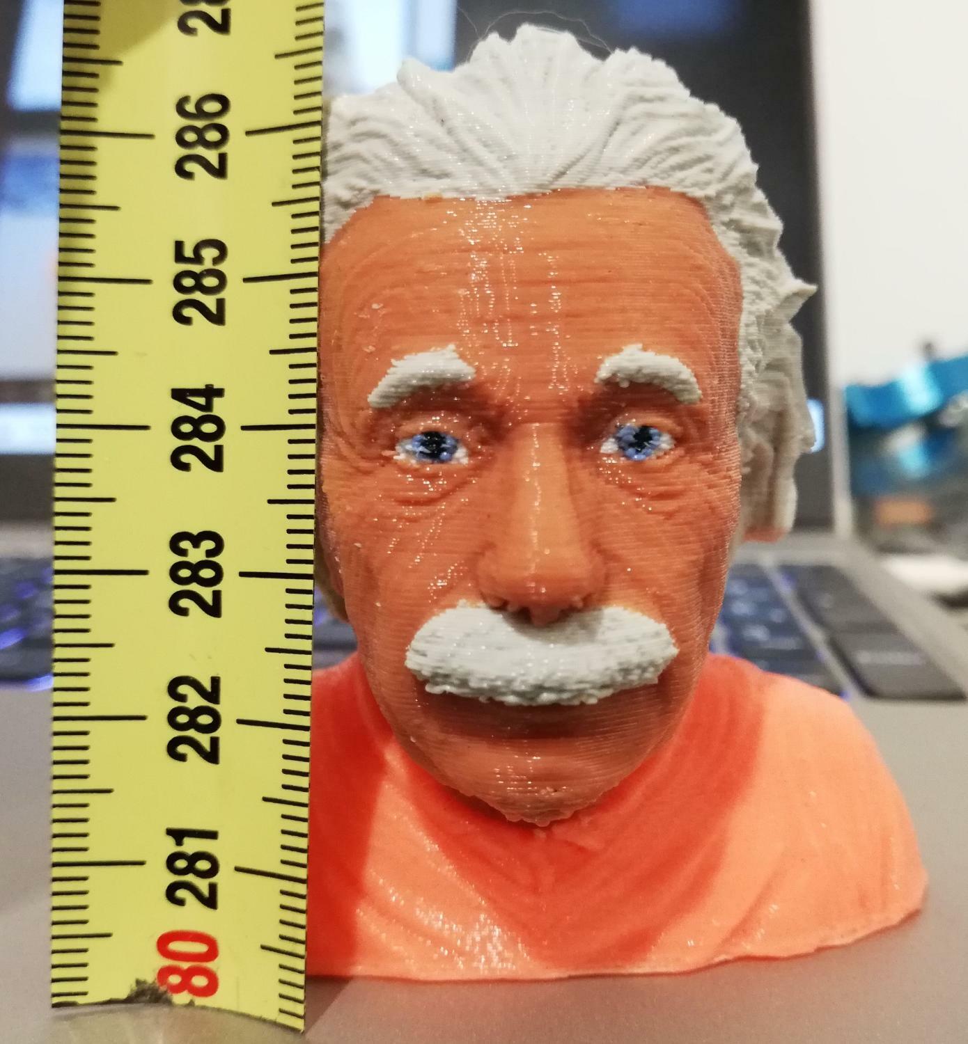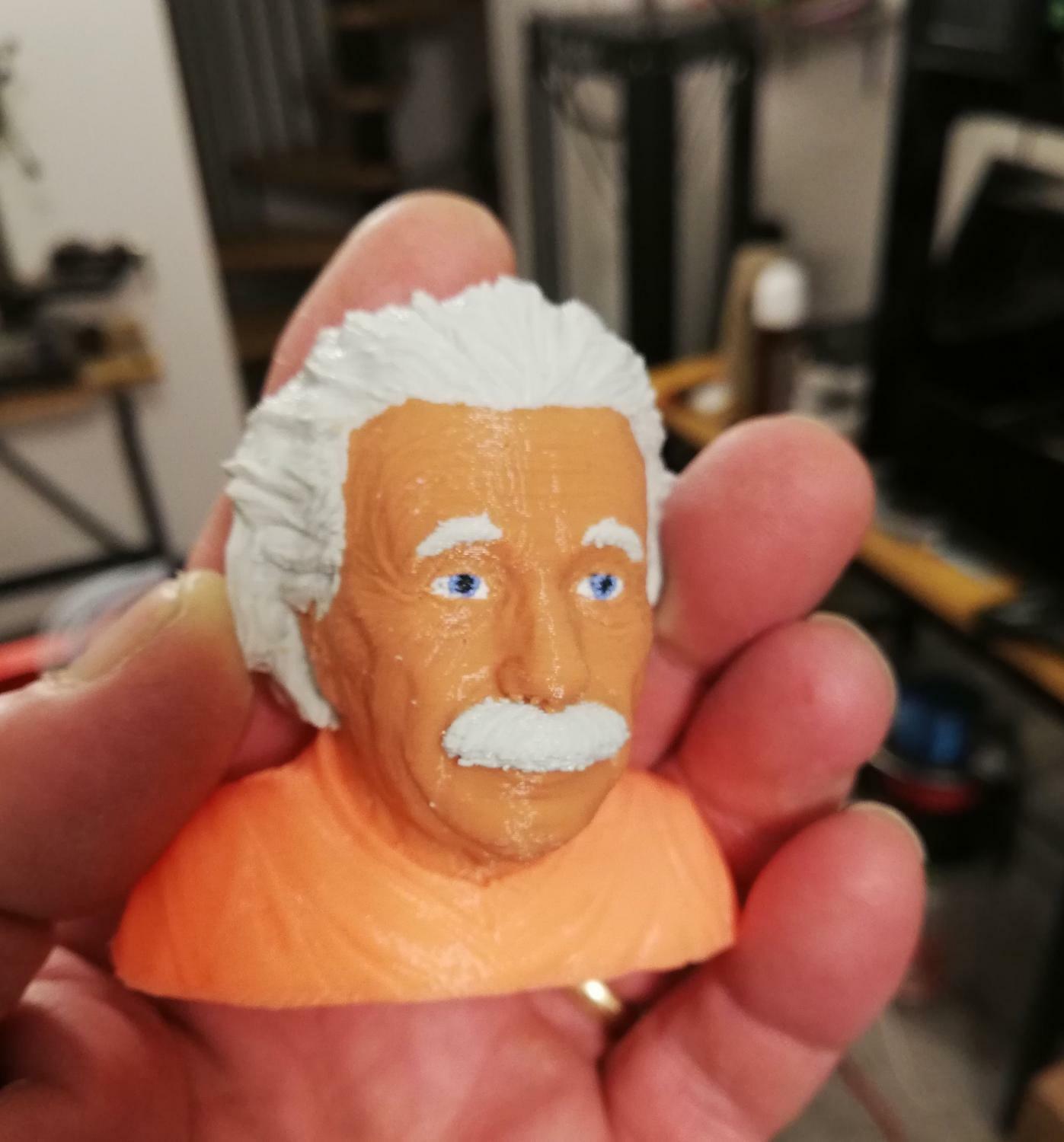 Che dire....... Prusa ha dato il "colpo di coda"...... mantenendo peraltro il tutto completamente free..... finalmente abbiamo un sw per colorare le mesh a piacimento...... Si insomma..... il buon Josef è riuscito nell'intento e devo ammettere che ha fatto un eccellente lavoro. Il fatto di "proiettare all'interno delle mesh le varie superfici verticali colorate è un'idea geniale che permette ai sistemi multicolore di lavorare al meglio...... Il busto di Einstein non so esattamente qual'è perchè è una vita che l'ho scaricato ma è uno dei tanti scaricabili da Thingiverse La stampa è a 0.2 mm layer e le foto in alta risoluzione evidenziano "difetti" (tra cui i layer) che a occhio si fa decisamente fatica a notare..... e non l'ho neppure ripulita come si dovrebbe..... insomma la stampa è più bella dal vivo che in foto..... Anche i capelli sono grigi e non bianchi..... ma le fotocamere dei cellulari sono troppo luminose per poter notare la differenza col bianco degli occhi Concludendo....... bella Josef......-
