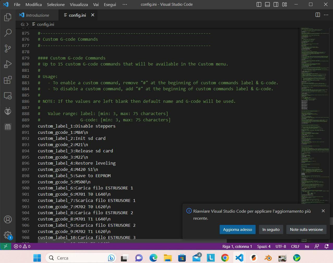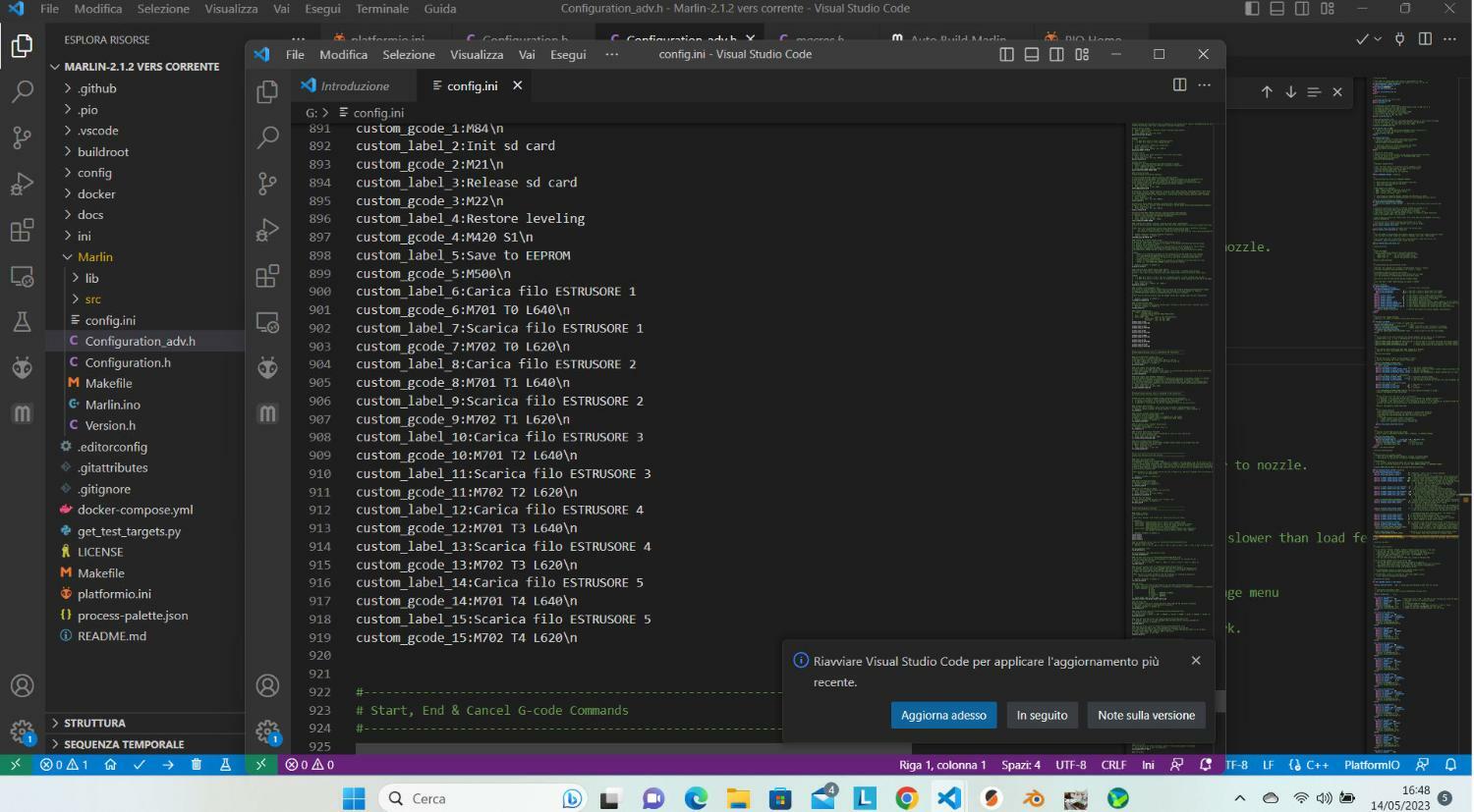 Per correttezza metto anche qui la soluzione che ho dovuto adottare per il "Load/Unload" dei fili nei 5 estrusori...... Purtroppo le funzioni nella pagina specifica del menu non funzionano, o perlomeno funziona solo l'estrusore 1 e non c'è stato verso di capire comne fargli cambiare estrusore..... A quel punto ho "cassato" quella sezione ed ho usato le macro gestibili dal BTT - TFT70 3.0. In pratica per la funzione carico/scarico ci sono i comandi "M701/M702" che fanno esattamente la stessa cosa della sezione load/unload..... Quindi è bastato modificare il file config.ini del TFT per avere i comandi necessari come da immagini dimenticavo.... grazie a tutti...... 😁 -