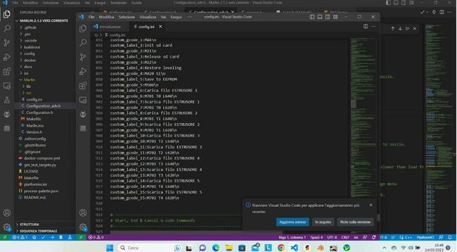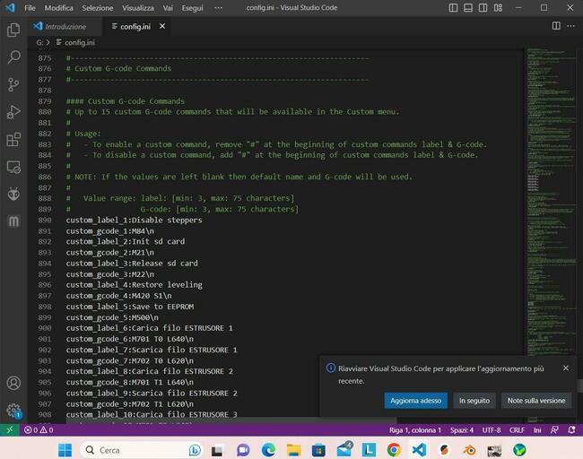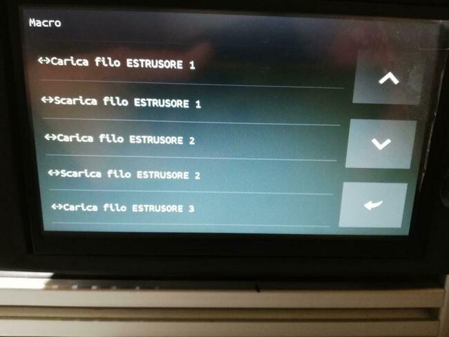 Marlin - caricamento/scaricamento filo in bowdenimmaginaecrea ha risposto a immaginaecrea nella discussione Software di slicing, firmware e GCode Per correttezza metto anche qui la soluzione che ho dovuto adottare per il "Load/Unload" dei fili nei 5 estrusori...... Purtroppo le funzioni nella pagina specifica del menu non funzionano, o perlomeno funziona solo l'estrusore 1 e non c'è stato verso di capire comne fargli cambiare estrusore..... A quel punto ho "cassato" quella sezione ed ho usato le macro gestibili dal BTT - TFT70 3.0. In pratica per la funzione carico/scarico ci sono i comandi "M701/M702" che fanno esattamente la stessa cosa della sezione load/unload..... Quindi è bastato modificare il file config.ini del TFT per avere i comandi necessari come da immagini dimenticavo.... grazie a tutti...... 😁