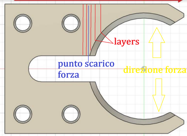 partiamo dal presupposto che non è un componente ideale ad essere stampato in fdm. Quindi lo hai stampato in verticale? I fori, essendo realizzati in questa direzione, risultano ovali. Inoltre, la parte a scatto, orientata così, ha il punto di sollecitazione proprio nella zona più fragile: quando scatta per bloccare l’utensile, tutta la forza si scarica esattamente tra due layer che è il punto piu' fragile. io lo stamperei piatto, come si vede in foto. per pezzi di questo tipo gli infill usati in industria sono intorno 80-90% ma è difficile fare un discorso assoluto sullo spessore delle pareti e dell'infill migliore senza un po' di matematica sensata. questo è il piu' adatto anche se il piu' adatto che puoi stampare per questa applicazione è asa (o abs). il materiale giusto per questa applicazione sarebbe il nylon ma non puoi stamparlo su a1 -