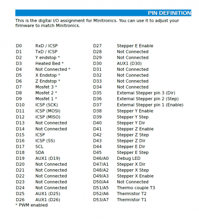su questa tabella si sono scordati di mettere quali pin supportano il pwm, guardiamo la tabella della v1 dove li hanno messi: i pin che supportano il pwm sono quelli da d1 a d9 e sono tutti utilizzati eccetto che per questo d4 (che non capisco dove sia) fatta eccezione per quella in d4 se vuoi collegare un altra "periferica" in pwm devi sacrificare qualcosa. se questo d4 esiste puoi mettere il servo li e il bl touch al posto di Z end stop il contrario oppure fai un arrosto, rosso +5v, marrone gnd. aux1\2 supportano il pwm? sembra di no. il bltouch funziona solo in pwm? non lo so, ma se funziona solo in pwm (cosi sembra) allora non funziona su aux perche a quanto pare aux non è in pwm. -