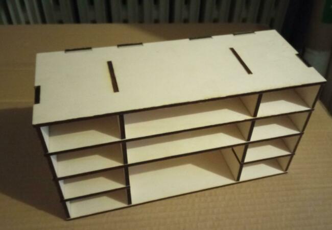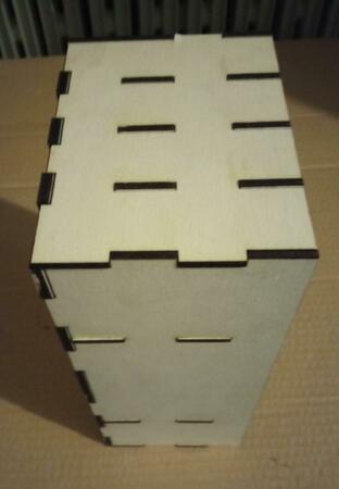 Il prototipo in legno ha funzionato, o meglio gli ingombri sono corretti, quindi ho proceduto a tagliare il legno per il progetto. Ho impostato i parametri dello spessore a 4.16mm, addirittura ho fatto il back da 5mm, pensando di stressare la differenza in rigidita' con quello in cartone, ora che lo ho tagliato direi che basterebbe 3mm.