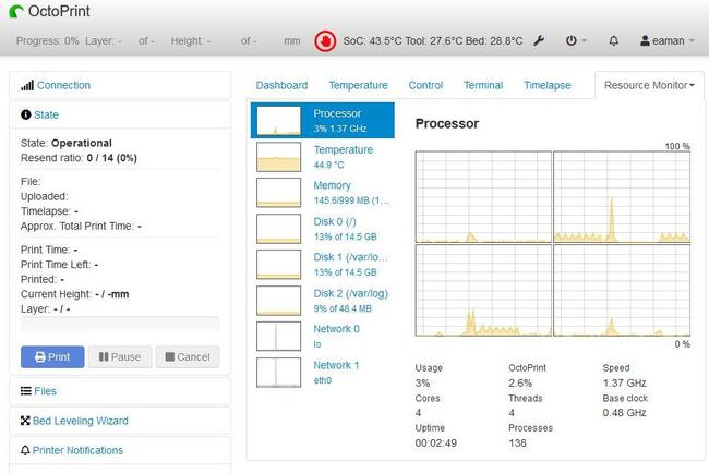 Se velete fare un setup economico per OctoPrint potete considerare un SOB Orange Pi piuttosto che una RapberryPi 4 che costa un botto. Ho provato a installare un release dedicata per le Orange Pi su una Orange Pi PC che avevo in casa, una SOB 4 core con 1GB di RAM che costa ~25e, e sembra funzionare piu' che bene, nel senso che il consumo di risorse di Octoprint e' ~4% quando stampa la mia Ender 3. Altre Info: Welcome to Armbian 21.05.2 Buster with Linux 5.10.34-sunxi System load: 2% Up time: 10 min Local users: 3 Memory usage: 15% of 999M IP: 192.168.0.4 CPU temp: 49°C Usage of /: 14% of 15G [ General system configuration (beta): armbian-config ] root@orange:~# cat /etc/debian_version 10.9 root@orange:~# lsb_release -a No LSB modules are available. Distributor ID: Debian Description: Debian GNU/Linux 10 (buster) Release: 10 Codename: buster root@orange:~# inxi -S System: Host: orange Kernel: 5.10.34-sunxi armv7l bits: 32 Console: tty 1 Distro: Armbian GNU/Linux 10 (buster) root@orange:~# inxi -F System: Host: orange Kernel: 5.10.34-sunxi armv7l bits: 32 Console: tty 1 Distro: Armbian GNU/Linux 10 (buster) Machine: Type: ARM Device System: Xunlong Orange Pi PC details: Allwinner sun8i Family rev: N/A serial: 02c000814b6e6d89 CPU: Topology: Quad Core model: ARMv7 v7l variant: cortex-a7 bits: 32 type: MCP Speed: 1368 MHz min/max: 480/1368 MHz Core speeds (MHz): 1: 1368 2: 1368 3: 1368 4: 1368 Graphics: Device-1: sun8i-h3-mali driver: lima v: kernel Device-2: sun8i-h3-dw-hdmi driver: sun8i_dw_hdmi v: N/A Device-3: sun8i-h3-display-engine driver: sun4i_drm v: N/A Display: tty server: N/A driver: sun4i_drm tty: 109x61 Message: Unable to show advanced data. Required tool glxinfo missing. Audio: Device-1: sun8i-h3-dw-hdmi driver: sun8i_dw_hdmi Device-2: simple-audio-card driver: asoc_simple_card Sound Server: ALSA v: k5.10.34-sunxi Network: Device-1: sun8i-h3-emac driver: dwmac_sun8i IF: eth0 state: up speed: 100 Mbps duplex: full mac: 02:81:4b:6e:6d:89 Drives: Local Storage: total: 14.94 GiB used: 1.87 GiB (12.5%) ID-1: /dev/mmcblk0 model: SD16G size: 14.94 GiB Partition: ID-1: / size: 14.49 GiB used: 1.87 GiB (12.9%) fs: ext4 dev: /dev/mmcblk0p1 ID-2: /var/log size: 48.4 MiB used: 3.9 MiB (8.0%) fs: ext4 dev: /dev/zram1 Sensors: Missing: Required tool sensors not installed. Check --recommends Info: Processes: 134 Uptime: 16m Memory: 999.0 MiB used: 182.2 MiB (18.2%) Init: systemd runlevel: 5 Shell: bash inxi: 3.0.32 Penso che per far girare solo Klipper potrebbe bastare anche la Orange Pi Zero LTS che ha 512MB RAM, non so se bastano anche per Octoprint. Per il solo Klipper con un frontend leggero magari potrebbe andare bene anche la versione a 256MB per quanto il prezzo cambia di poco... Comunque per chi ha una scheda a 8bit sulla stampante una scheda esterna con Klipper per ~15e potrebbe essere una soluzione interessante 🙂-