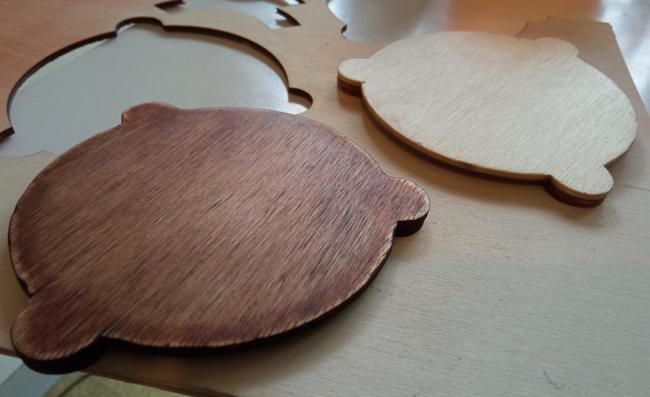 4. Dunque in questa fortunata serie su come migliorare il legno laminato e smorto per il taglio laser possiamo fermare un paio di risultati: Nella foto si vede il legno originale con sopra due sotto tazza, quello chiaro trattato con olio paglierino + idrolacca, quello scuro macchiato con colorante paglierino e trattato con gomma lacca. Visti da sopra: Al tatto sono entrambi super lisci, quello scuro laccato e' un po' meno liscio e riflettente, odora un po' di spirito. Notare che sono stati entrambi colorati con lo stesso colore all'anilina: noce antico. Le parti rossastre sono state fatte con una diluizione in alchol isopropilico (perche' quello io ho in casa, dovrebbe andare bene anche qualcosa di meno fine) mentre quello scuro e' diluito in nitro. Quindi se volete qualcosa di economico vi consiglierei olio Paglierino e colorante (costa tipo 1.5e a bustina per 0.5l di colorante), se volete una finitura per interno l'Hydrolac e' ottimo pero' e; in latte da ~750cc che costano in negozio piu' di 20e.