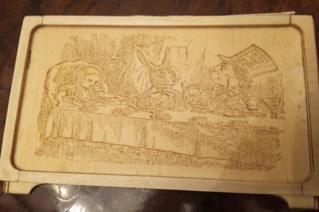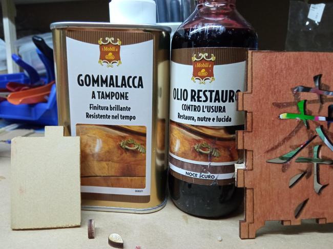 22. Io sto per andare a comprare un po' di gomma lacca, avendo gia' l'olio paglierino che fa da lubrificante potrei provare anche questa pazzia.. Piu' che altro dato che per il momento sto tagliando del pioppo di bassa qualita' mi piacerebbe provare qualcosa per scurirlo, se lo trovassi direi dell'olio danese. Per altro leggevo in giro che si possono fare dei trattamenti interessanti anche con la nitro, cosa che non mi dispiacerebbe dato che gia' la uso con l'aerografo. Nel frattempo ho fatto questa scatola porta the con gli "scarti" (si noti le cornici fatte con i pezzi di legni rimasti, pero' tagliate sempre al laser perche' ormai sono diventato super pigro! Lo sfondo e' stato trattato con olio paglierino mentre le cornici e il fregio sono passate con l'hydrolac, il risultato se non si vede e' che lo sfondo e' piu' dorato / morbido mentre le cornici sono piu' chiare e riflettenti. - Altre: http://store.piffa.net/laser/tea/