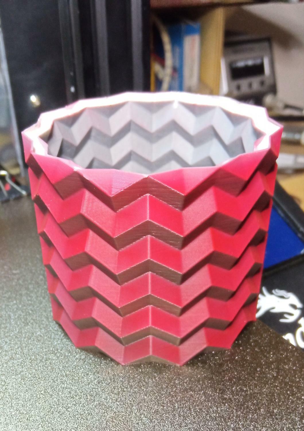 Dio, se ci ragioni sopra un attimo la puoi fare in vase mode e orientativamente riduci il tempo di stampa e il materiale a 1/3. Bisognera' almeno farla in 2 parti, il coperchio separato. Io ci faccio i vasi cosi': stampi in vase mode, coli il gesso, giri giri cosi' va sui bordi e ottieni roba consistente e pesante. Questi sono piccoli ma l'idea e' la stessa: -
