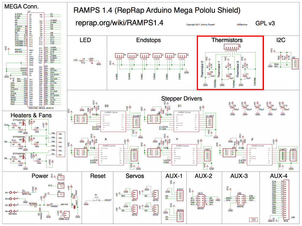 A questo punto sospetto che hai un problema nella resistenza di pull'up .Il termistore per lavorare si appoggia ad una resistenza che li fornisce 5 volt. sembra che nella tua elettronica questa resistenza da 4,7k hom è difettosa e non stia dando i 5 volt al termistore. Ti incollo qui evidenziato in rosso uno schema col la relativa sezione dei termistori. Non è la tua elettronica ma sono tutte uguali. Se avessi un minimo di pratica di elettronica potresti provare a verificare la resistenza o in alternativa aggiungerne una sempre da 4,7k hom che svolga quella funzione. I 5 volt sono disponibili sui connettori degli end stop