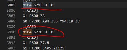 Salve, sto tentando di preparare un temp tower con cura ma non riesco a settare i valori di temperatura a determinate altezze di stampa: La torre preparata parte da 220 gradi e arriva a 195. in cura effettuo le modifiche con il suo sitema di "post-elaborazione" Inizio impostando layer 1 a 220° successivamente imposto ad altezza 10mm una temperatura di 215 e continuo con impostare ogni 10 mm ulteriori 5° in meno. (come da immagine allegata). In cura vedo le modifiche da apportare vicino al pulsante slicer, faccio lo slicer ed ottengo il modello Il problema è che se vado in stampa la temperatura rimane sempre quella di partenza non variando mai. vi metto ulteriori immagini del Gcode dove ho riscontrato che al comando M104 dove imposta la temperatura poi ne segue un'altro dove riporta la temperatura a 220°. Al primo layer la temperatura viene impostata giusta, ma successivamente succede il problema. Non riesco a capire. -