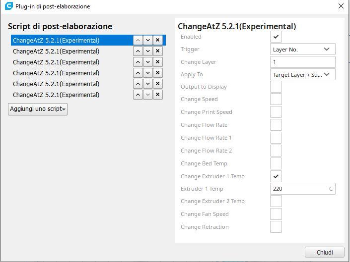 Ho fatto così: Inseriti tutti i valori poi ho tolto la spunta su tutti i valori di temperatura e ho premuto chiudi. Ho premuto vicino a sezionamento il simbolino martello e chiave inglese per riaprire il menù di cambio gcode. Ho reinserito la spunta su tutti i valori che mi si sono ripresentati. Ho fatto chiudi e ho sezionato nuovamente. Risultato stesso problema. -