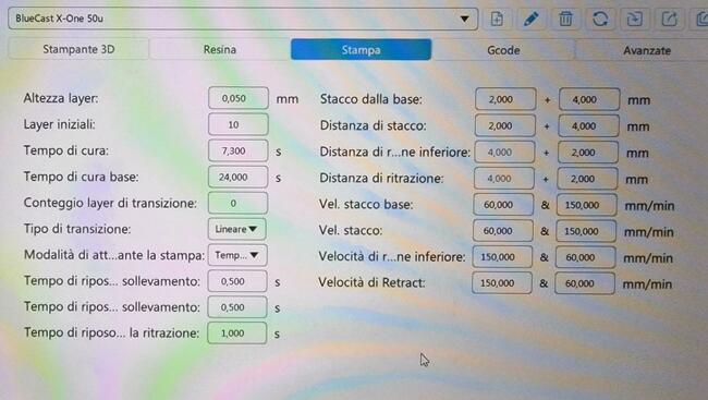 Allego una schermata con i settaggi attuali in Chitubox.