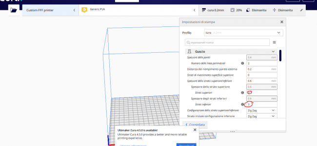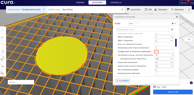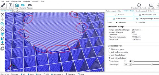 15. il cerchio giallo e'la parte inferiore del foro, ci deve essere. Sopra di questo ne verranno creati altri 2 (ho messo 3 strati superiori e inferiori) Ok, con cura e' la migliore soluzione, ogni slicer ha i suoi pregi e difetti, ma questa situazione che ho presentato, sbaglio o ' e' molto ricorrente in moltissimi pezzi ? Pensavo che sbagliavo qualche settaggio, ma evidentemente deve essere cosi'. Voi come fate quando vi si presentano questi casi?