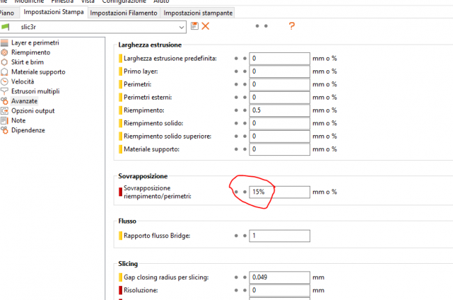 17. Dico la mia, in slic3r esiste un parametro che permette di fare quello che spiego adesso: Ritrazione settata a 3mm, quindi ritrae 3mm e subito ricarica 3mm Sì può dire a slic3r di ricaricare una lunghezza di filamento maggiore della ritrazione, adesso non ricordo la voce ma so che esiste. Spero di essere stato chiaro.