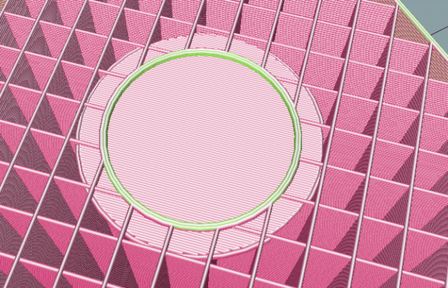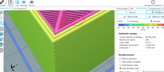 13. Scusami se insisto, quel valore incide solamente tra riempimento e parete interna: valore a 15% valore esageratamente portato a 100% mentre la parte centrale, dove inizia a fare il foro rimane invariata, mostro la zona con valore a 15% e con valore a 100% e' vero che quando fa le righe blu non dovrebbe succedere niente se le parti finali cadono giu, dato che sopra lo slicer costruira il foro centrale cosi: quindi a pezzo finito non notero' niente. Ma mi sono accorto che a volte, invece di andare giu ( parlo delle righe blu sopra citate) me le trovo, in fase di stampa, arricciate verso l' alto. E' qui che iniziano i problemi, l' estrusore sbatte contro questa montagnetta di materiale. Ho abilitato lo Zhop, non sempre risolve. Forse, concludendo, e' una mia fissa mentale tutto questo post, ero curioso di vedere come altri (molto piu' esperti di me) affrontano questo problema. grazie