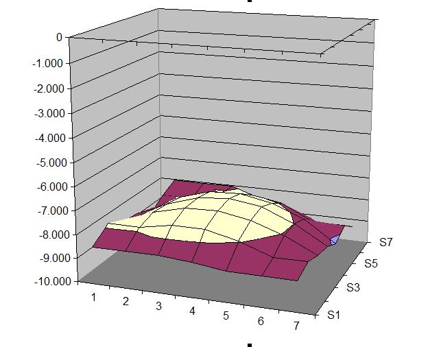 22. Ciao, come da titolo ho da risolvere il problema del piano convesso sulla mia mini kossel. Innanzitutto il firmware non posso modificarlo perchè è in cinese ma non sembra essere quello il problema... probabilmente sono i oche sto sbagliando qualcosa. Gli endstop sono alle distanze corrette come da istruzioni, perciò non penso siano loro il problema (anche se potrebbe). La distanza centrale dal piatto è corretta ma quelle corrispondeenti alle torri risultano troppo in basso e nonostante io provi ad avvitare le viti dei carrelli non cambia nulla. Il problema persiste da giorni rendendo inutile ogni mio tentativo di stampa. Allego una foto del grafico tratto da excel secondo i dati dell'autocalibrazione.