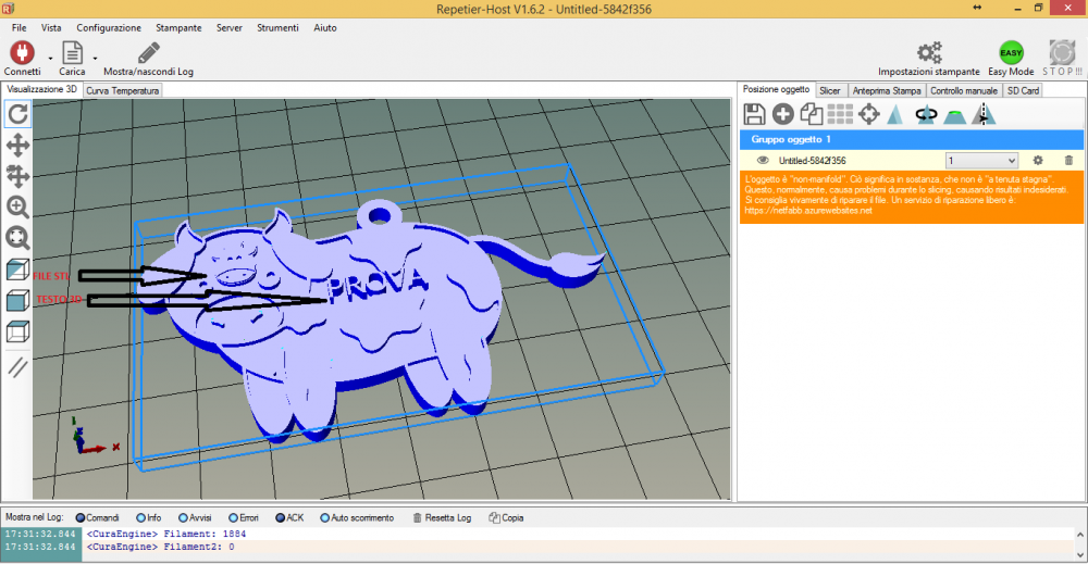 salve a tutti, ho scaricato un file stl e ho aggiunto un testo 3d e un altro file stl. Il mio problema è che quando effettuo lo slicing (curaengine) vedendo l'anteprima di stampa non vedo la scritta 3d che ho aggiunto al file stl ma vedo solo i 2 file stl