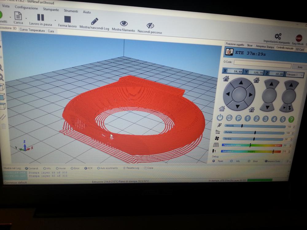 non penso siano fili di alto costo anche se li ho pagati 30 euro al kilo circa, comunque vada bisogna adattarsi a stampare al meglio con questi visto che ne ho molti kg della stessa marca. penso che per ora sia giusto cosi' perche' a volte e spesso butto via cose per errata partenza o errato disegno. comunque sono riuscito a costruire un convogliatore per ventola da 50mm e l'ho gia' assemblato a breve lo monto ma la staffa non va bene piu' avanti devo disegnarne una io con i fori a una distanza maggiore...non so ancora bene come fare il cavo la ventola e' da 12 volt 3 fili dove posso collegarla? p.s. non stampa benissimo, ci sono difetti e saltelli, pero' a guardare le foto in internet di chi ha messo di tingeverse questo convogliatore....e' stampato meglio il mio!!! sara' grezzo ma.....che soddisfazione!!!!!! come vedete nelle foto ho anche realizzato dei ricambi per al stampante, appena arrivano le viti trapezioidali li monto, con cuscinetti mi sembra meglio che sulla plastica o no? -