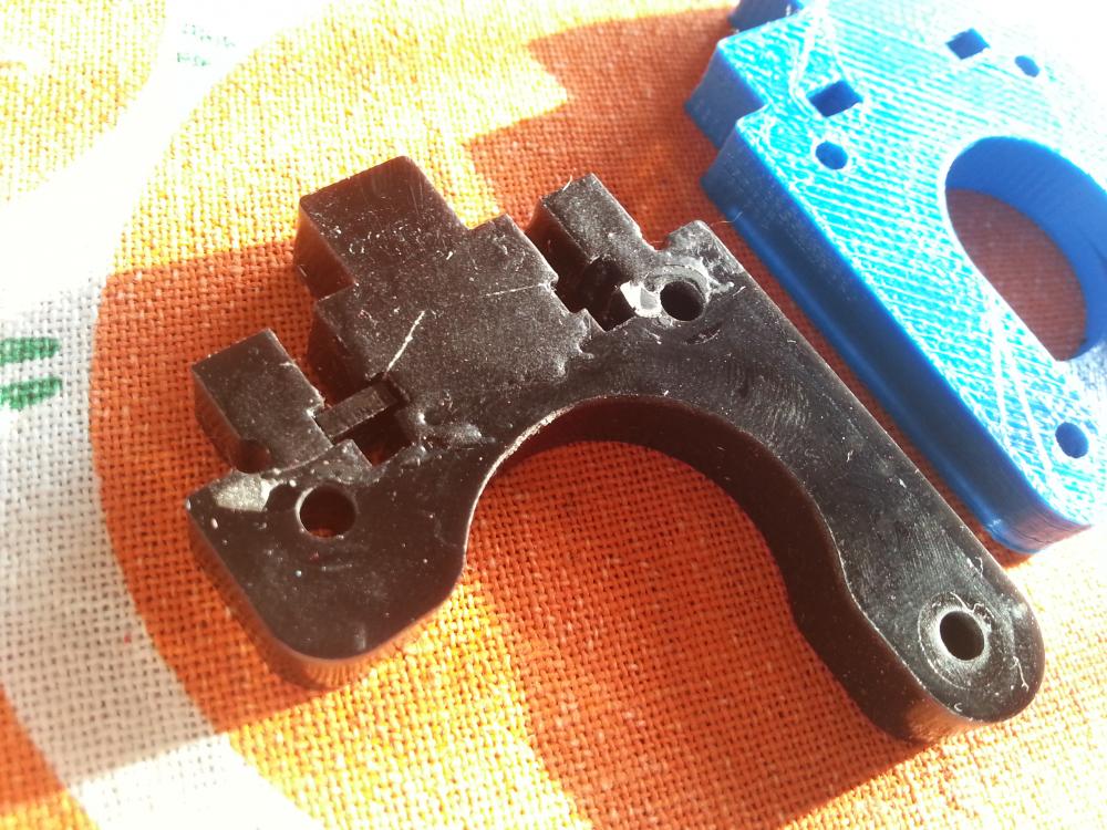 3. per la gomma c'e' tempo, prima va fatta una macchina seria che funziona bene e devo anche impare a disegnare, poi la gomma si fara'... finalmente un pensiero in meno...ecco il pezzo che in fase di montaggio si era frantumato e che ho ricostruito con attack e poi con colla resina bicomponente..meno male che ha retto fino ad oggi ma...ora potrei anche buttarlo perche' l'ho sostituito con uno stampato da me...che e' anche piu' solido!!! p.s. il pezzo calza come un guanto!
