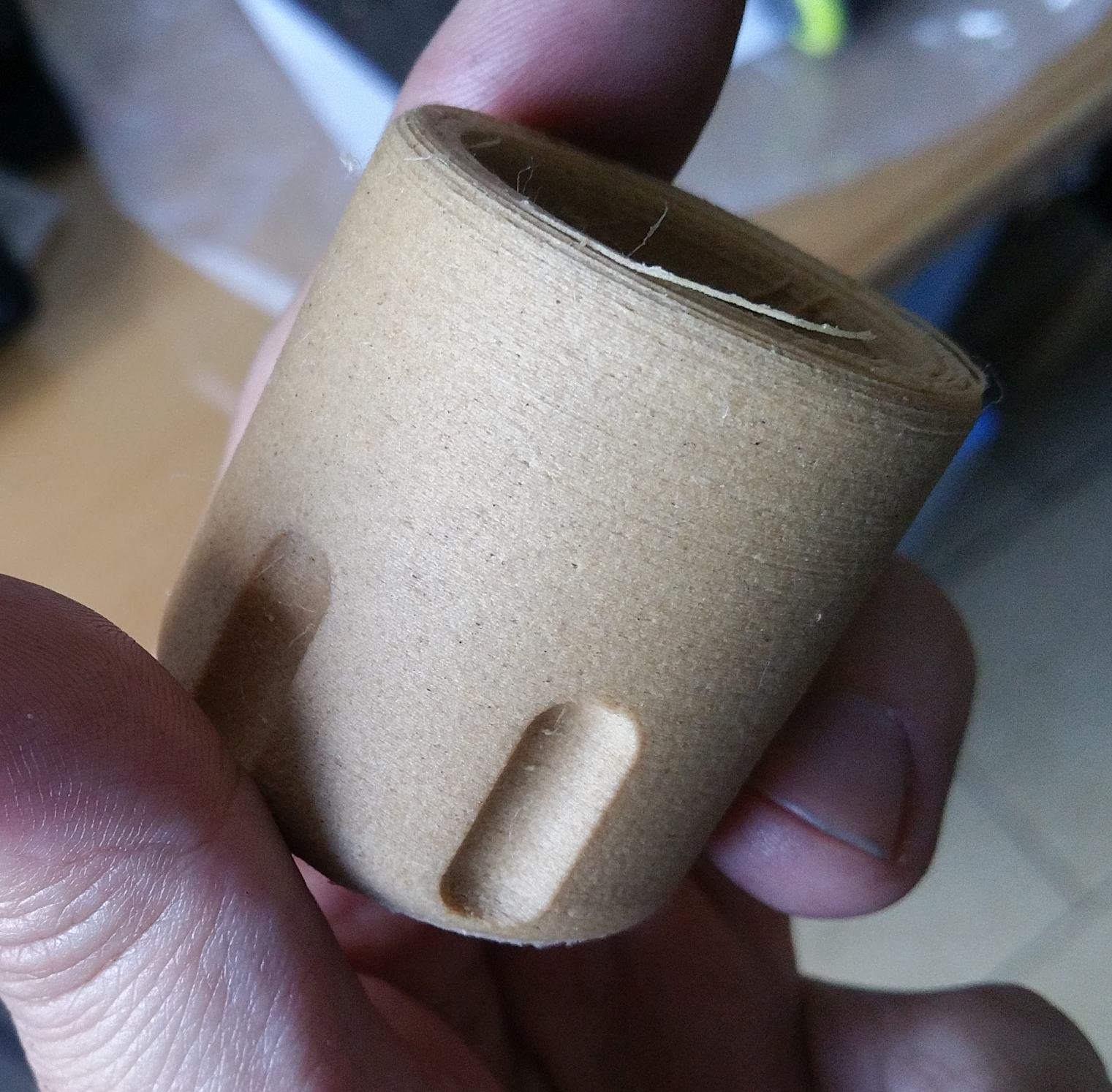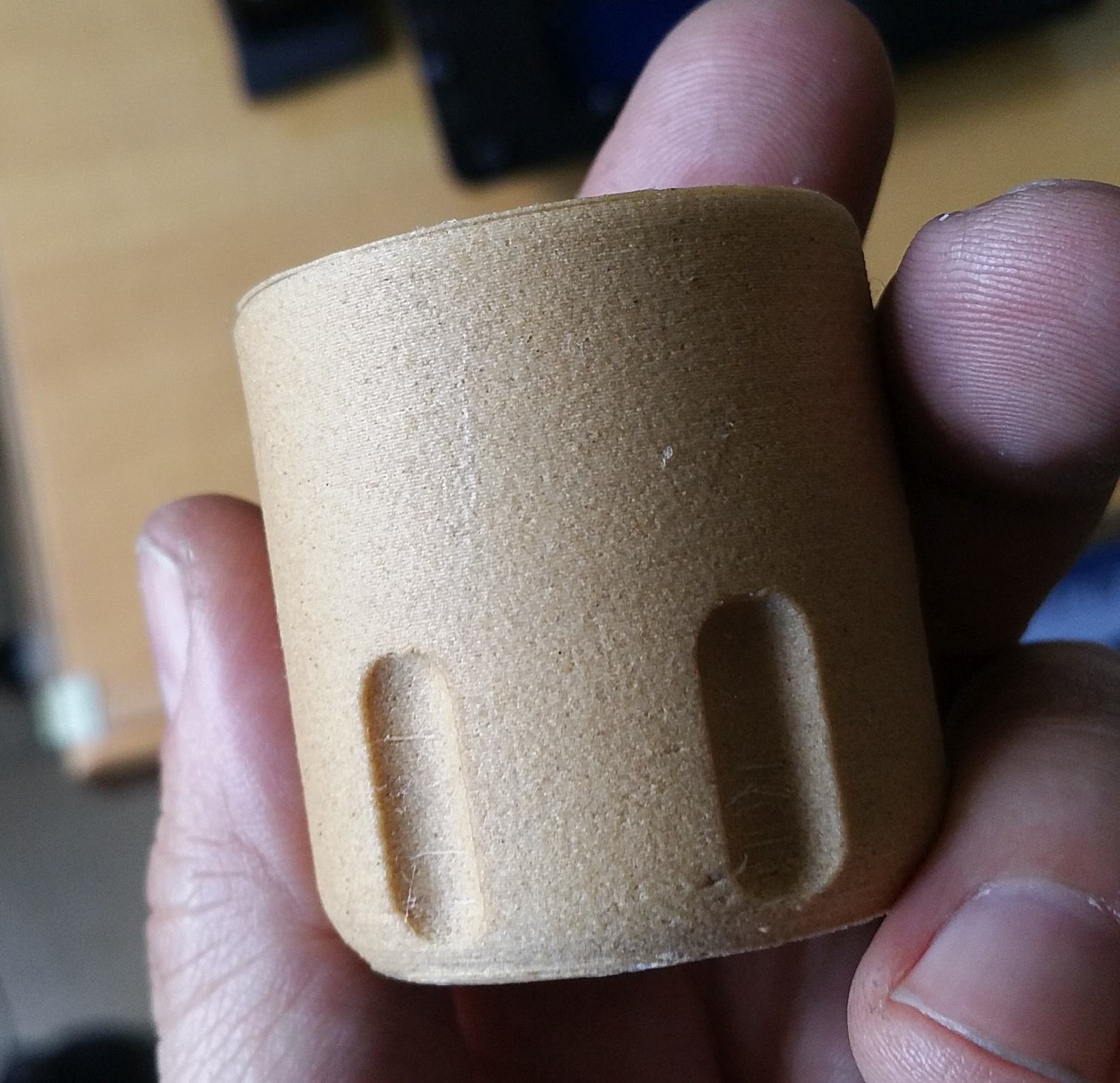 Io ho provato il filamento wood della FormFutura (colorazione pino). Sono riuscito a stampare con l'ugello da 0,4 senza problemi, il materiale esce bello fluido a 200°. Ho solo dovuto impostare un po meno materiale nel primo layer altrimenti, vista la vicinanza al piatto, faticava a fare uscire il filamento. A parte il profumo gradevole quando si stampa, mi ha impressionato la distensione dei layer, senza alcun trattamento di carteggiatura sono perfettamente fusi uno con l'altro e non si distinguono, non mi era mai capitato. I contro sono l'estrema uniformità del colore e l'effetto finale più da cartone pressato che da legno, ma forse è anche il colore pino che non aiuta. Purtroppo la parte superiore non è finita poichè si è attorcigliato il filo proprio negli ultimi passaggi.