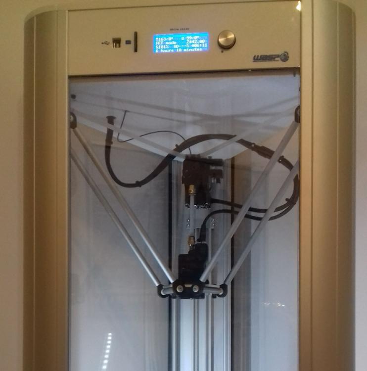 Delta Wasp20x40 versione 2017 piano riscaldato in acciaio nuova ancora in garanzia 10 ore di funzionamento. PREZZO 1350 € Disponibile anche kit per stampare con argilla. Contattatemi Via MAIL : info@3dlaboratories.it Area di stampa: 200mm di diametro x 400mm di altezzaRisoluzione strato: 50 micronDiametro ugello estrusore: 0.4 mm (in dotazione con la stampante), 0.7 mm, 1.2 mmFilamenti utilizzabili: 1.75 mm di diametro (PLA, ABS, Flex, HIPS, PETG)Velocità massima: 300 mm/sVelocità spostamento massima: 300mm/sESTRUSORE INTERCAMBIABILEEstrusore Spitfire Black e LDM Wasp Extruder. Con l’estrusore per materiali fluido-densi possono essere utilizzate anche argilla, gres, porcellana, terraglia, etc…SOFTWARESistemi operativi: WIndows, Mac, LinuxSoftware slicing: Cura – SLic3r – Simplify 3dTipo di file: .stl, .obj, .gcode,INTERFACCIASD Card – Schermo LCDDIMENSIONI FISICHEDimensioni: 49 x 44 x 87cmPeso macchina: 20 kgDimensioni per spedizione con imballo di cartone: 59x51x102cm, peso 24 kgALIMENTAZIONEInput: 220/240V 50/60 HzPotenza assorbita: Mx 300WTEMPERATURAAmbiente d’utilizzo: 20-30 C°Magazzino: 0-30 C°Ugello: max 260 C°Piano Riscaldato: max 100 C°MECCANICATelaio e copertura: Alluminio, policarbonato e plexiglassPiano di stampa: acciaioMovimenti: pattini ad alto scorrimento su profili in alluminio anodizzatoBOWDEN SOSPESORende possibile scaricare l’inerzia sugli elastici di sospensione, e migliorare esponenzialmente la qualità e la velocità di stampa. Leggi di più sul Bowden SospesoRESURRECTION SYSTEMIl sistema riprende le stampe interrotte in caso di spegnimenti accidentali o improvvisa mancanza di corrente. Leggi di più sul Resurrection System