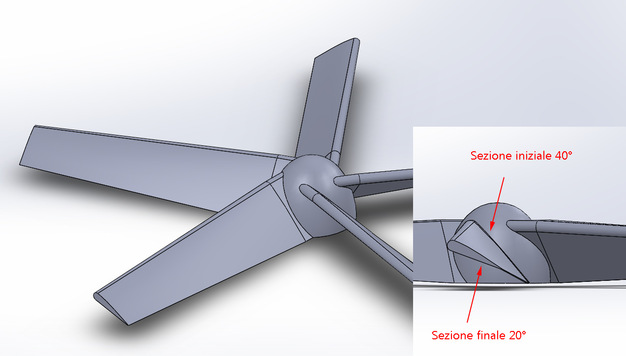 Questo è il design di un'elica per motori con "molta" coppia, se mi dai un numero di giri del motore, il diametro dell'albero sul quale viene fissata e il massimo diametro che possono avere le eliche senza sbattere sul corpo centrale del drone posso modificarti questo 3D e passarti un .stl adatto - Come vedi ti ho messo in evidenza gli angoli di attacco del profilo finale ed iniziale dell'elica (ma sono degli angoli che ho preso a culo..non sapendo su che motore montarle sono casuali..) -