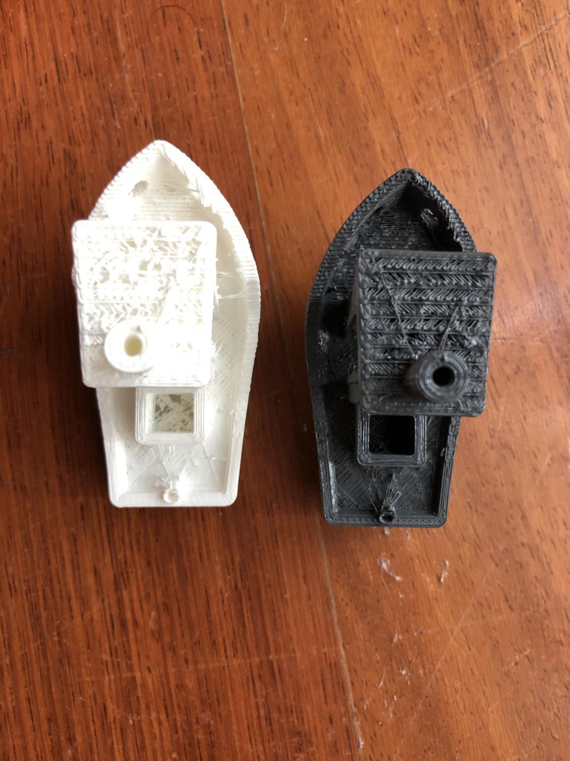 Ciao a tutti, vi chiedo di aiutarmi perché sto impazzendo da una settimana... le mie stampe si presentano con layer troppo visibili, ed alcune volte sono presenti escrescenze (come se si estrudesse troppo filamento) mentre altre volte sono presenti mancanze di filamento (troppo poco filamento estruso). Spessissimo si bloccava il filamento all’interno dell’estrusore durante la stampa, così ho dovuto disabilitare la retrazione e il problema non si presenta più (a costo ovviamente di una maggiore post-produzione). Mi viene da pensare che il problema sia all’interno dell’estrusore. Come potrei eventualmente pulirlo? L’ho già smontato e pulito più volte con il bastoncino metallico, ho anche infilato un filettino di rame dentro il nozzle per cercare eventuali intasamenti ma niente, e il problema rimane. In ogni caso, i bordi delle pareti non combaciano, ed ottengo così pareti ruvide, ed è questo il vero problema che rende le stampe quasi inguardabili. I parametri di stampa che utilizzo sono estrusore a 210 gradi, piatto 60, e lo slicer è Cura. Ho provato a diminuire il flusso di stampa al 90% (barchetta bianca), ma non cambia rispetto al 100% (barchetta nera). Grazie per il vostro aiuto. -