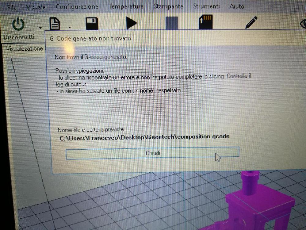 4. Ciao a tutti, ho provato a cercare, ma non ho trovato altri post che chiedevano aiuto per questa cosa. Ho un problema con lo slicer. Lo faccio partire e dopo pochissimo mi genera un messaggio di errore, come nella foto. Non so proprio come risolvere il problema. Mi aiutate?