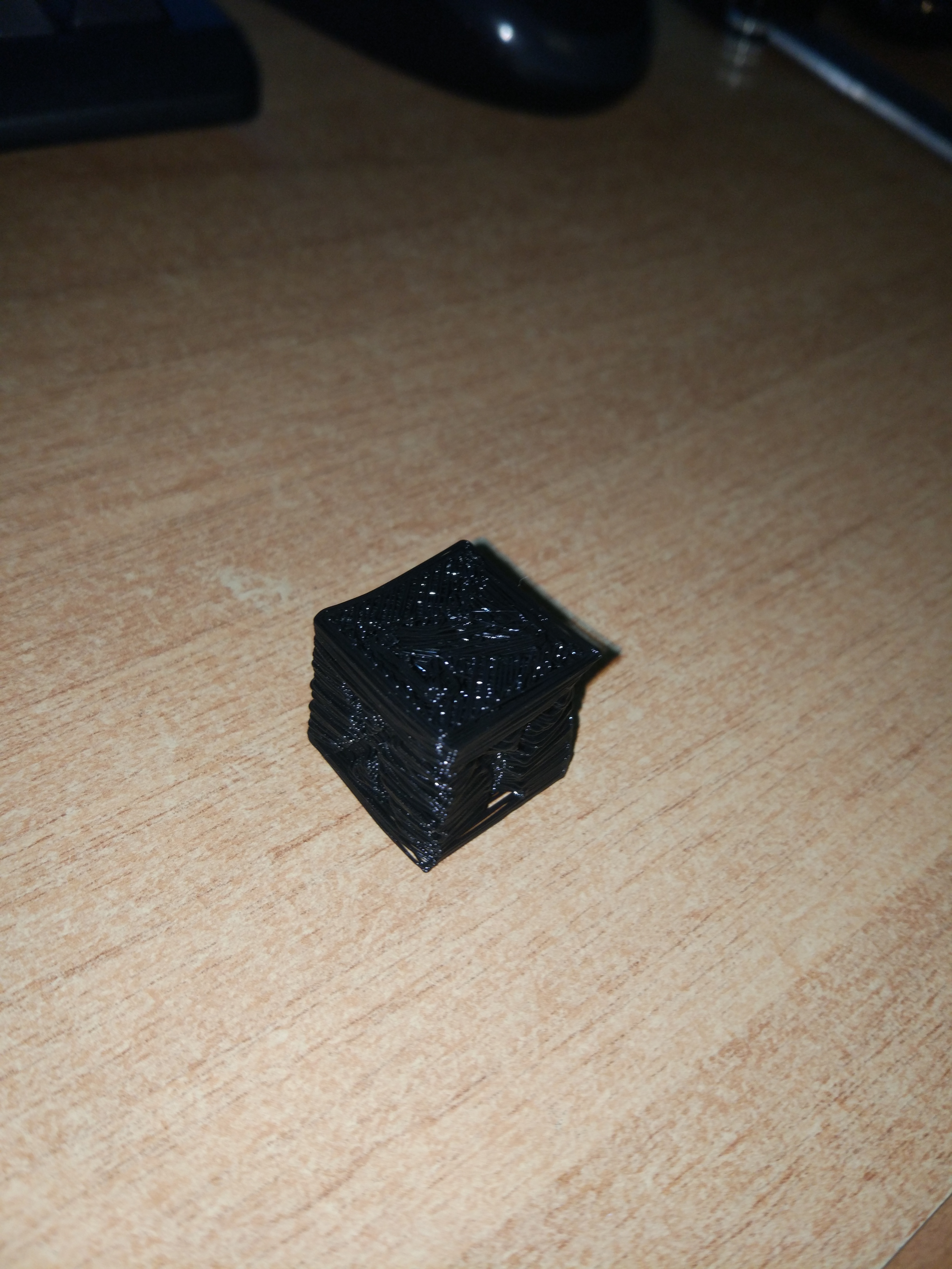 Questo è quello che sono riuscito a fare stampando il cubo con valori di default e senza raffreddamento... Un obbrobrio i layer proprio non si attaccano tra loro e sono tutti storti.. -