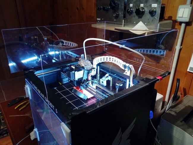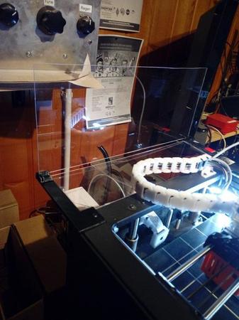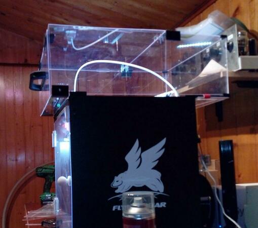 Salve, dopo aver costruito lo sportello anteriore per questa stampante seguendo uno dei tanti progetti su Thingiverse, ho deciso di costruire la copertura superiore per conto mio con quello che avevo in casa e, ovviamente qualche pezzo stampato. Allego due disegni e i file per SketchUp (quindi modificabili) dei pezzi che ho disegnato. La struttura va completata con angolari in pvc per chiuderla completamente e dotata di una maniglia qualunque, io ne ho stampata una presa sempre da Tingiverse. I fogli di plexiglass sono da 2 mm, li ho acquistati in un Brico e si tagliano con estrema facilitá... basta passare qualche volta un cutter tagliente e poi spezzare lungo la linea. Per aprire lo sportello superiore ho messo due cardini in metallo fissati con vitiche ho trovato sempre al Brico. Copertura Ghost5.skp Il pannello n.5 ossia il coperchio che poi si apre, l'ho fatto di qualche mm piú largo in modo che si appoggi ai due laterali (pezzi 2 e 3). Nelle foto mancano gli angolari in pvc che chiuderanno completamente il coperchio, ma giá cosí la temperatura interna rimane bella alta. Per qualunque info sono a disposizione. I quattro pezzi che tengono su il tutto, vanno fissati alla stampante tramite le quattro brugole della struttura giá esistenti. Non ho fatto i fori sui pezzi stampati in quanto li ho praticati col trapano dopo aver misurato col calibro appoggiando il pezzo stampato. Gli angolari superiori li ho fissati con Attack, mentre quelli inferiori sono solo appoggiati in modo da poter togliere il tutto senza problemi e senza svitare niente. -