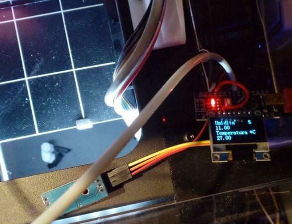 Ho deciso..... di inserire un controllo umiditá e temperatura dentro la stampante... Avevo nel cassetto un piccolo display Oled.. di Arduino ne ho che potrei aprire un concessionario... di tutti i tipi (ho appena ricevuto il meraviglioso Arduino Nano RP2040 connect, dotato di bluetooth, wifi, giroscopio, microfono... che useró in futuro....), ho quindi preso un Nano, gli ho buttato dentro il firmware che avevo scritto per la scatola umidificatrice dei miei sigari Toscano Garibaldi e ora sto disegnando un case... Con questi pochi pezzetti si puó comandare una ventola che ad una certa soglia di temperatura o umiditá, fa il ricambio aria. Allego sketch per arduino (al posto della schedina Arduino si puó fare anche un semplice circuito con un ATmega 328, un quarzo e due condensatori e funziona perfettamente....). Il sensore é un DHT11... ce ne sono dei migliori ma per questo scopo funziona perfettamente. Tutte le scritte che appaiono sono modificabili dallo sketch. Umidit__Ghost5.ino -