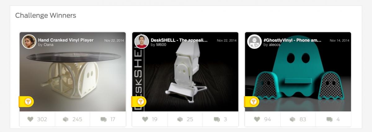 Beh, sono un po' di parte per giudicare gli altri lavori, però in effetti... non penso abbia vinto il miglior progetto. Il tema era creare un oggetto che avesse a che fare con la musica partendo dal logo di una etichetta discografica americana (GhostlyVinyl). Il vincitore ha creato un improbabile, anche se ben fatto, giradischi a manovella, il secondo un porta testine da giradischi dalla forma orribile e con il logo del tema incollato su un lato. Il terzo è il mio... -