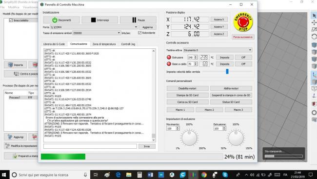 Qualcuno sa dirmi cosa può provocare questa interruzione della stampa? Questa sera è già la seconda volta che succede, e la prima volta ho già riavviato (stampo dal computer). Nel computer ho anche installato Cura (che comunque non uso) e in ogni caso non è mai andato in conflitto con Simplify durante la stampa. Durante la fase di stampa, nello schermo della stampante apparivano gli stessi caratteri strani che ho visto in un altro post di qualcuno nei giorni passati, e poi man mano sparivano. Al momento ho anche problemi con il mouse Wi-Fi (collegato al computer tramite un'altra USB), per cui mi chiedo se non possa essere quello che dà interferenza all'intero sistema(?)