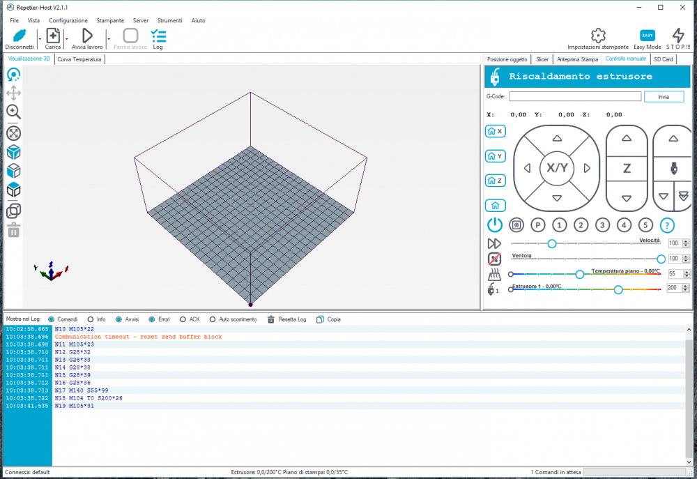 Ciao ragazzi, Ho cambiato scheda per poter mettere il nuovo marlin sulla mia geeetech aluminium, i primi giorni tutto ok, ora non si connette piu a repetier host, cioè si connette ma non invia i comandi. Idee??? il baud rate è giusto. -