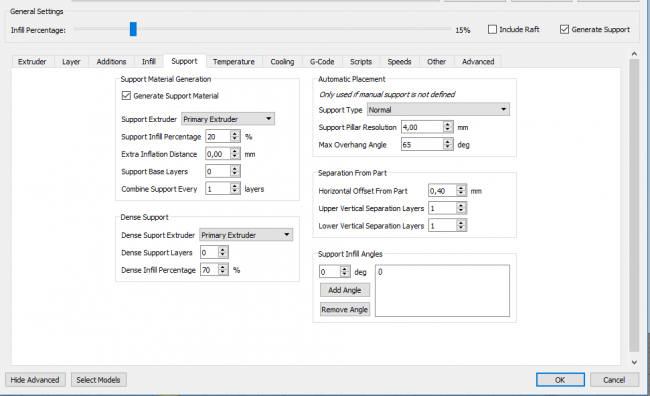 Ho provato a mettere 0.1 ma nulla, rimane uguale. Cioè è come se i supporti nell'aria di angolo inferiore a 65 gradi impostato non li mette...come si mettono manualmente? -