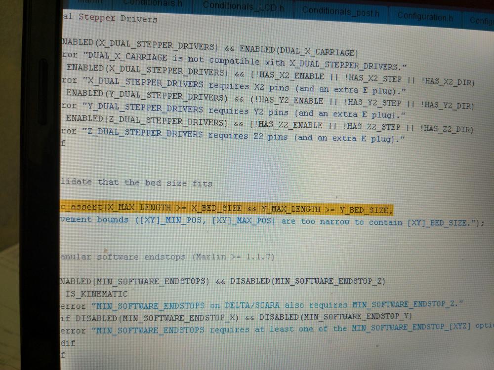 24. Mi da vari errori ma non so dove e cosa devo scrivere... Per esempio qui (immagine) mi dice che la lunghezza massima della x e y devono essere maggiori o uguali a quella del bed... Ma io nella configuration ho trovato solo x_bed_size e y bed_size, non la lunghezza massima... E poi quando vado a copiare i due file di configurazione dalla cartella anet a8 alla cartella principale Marlin, questi due file vanno modificati dentro?