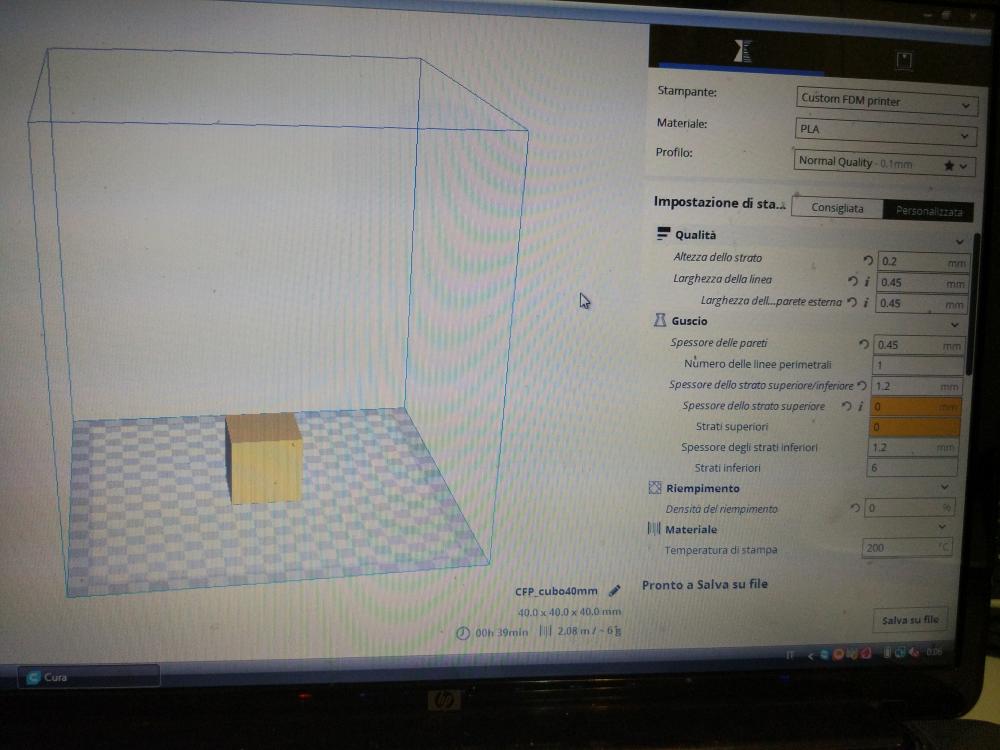 22. Buonasera a tutti, mi servirebbe stampare un cubo 40x40x40mm vuoto e senza la parte superiore (quindi aperto) per misurare se le pareti hanno la giusta "misura" rispetto a quello impostato da me a programma con Cura, qualcuno sa come fare? Per farlo vuoto basta mettere 0% di riempimento, giusto? Ma per togliere la parte sopra??? Grazie in anticipo.